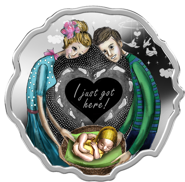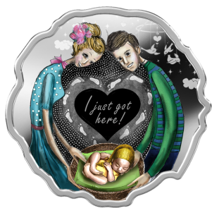 “I just got here” coin stands for genuine affection coming straight from your heart and positive emotions eternalized in fine silver. The value of this unique collectible will never fade. Highest purity of silver and precise finish- ing with colorful digital printing make it an unforgettable gift for all parents and their little ones!
