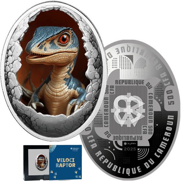 Представьте себе момент, когда один из самых быстрых хищников мелового периода вырывается из своего доисторического яйца. Монета запечатлела эту сцену с помощью линзовой технологии, создавая поразительное трехмерное ощущение глубины и движения. Это тщательно продуманный дизайн, объединяющий мир доисторической эпохи и современное искусство чеканки монет.